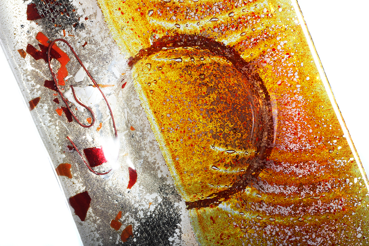 Made from solid, hand-cut glass with other varied materials used to add colour and texture within the glass. The finish is glossy smooth on the top surface and can be burnished to a shine. There may be surface irregularities and ripples, which are intended as part of the character and nature of the design. The underside is more textured, partly due to the creation process, which thankfully makes for easy carrying and transport. All colour is permanent and may be semi-transparent to a varying degree, allowing light to shine through. Inclusions of metal are generally opaque.