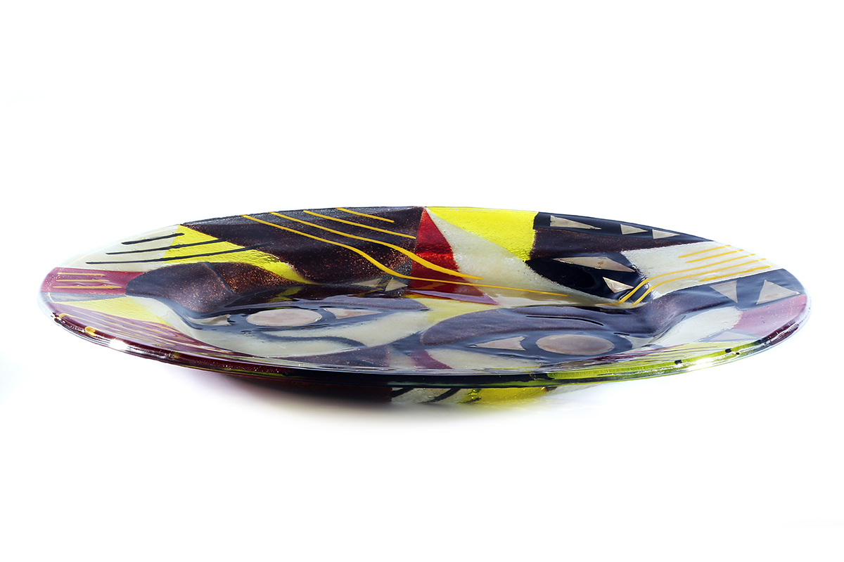 Made from solid, hand-cut glass with other varied materials used to add colour and texture within the glass. The finish is glossy smooth on the top surface and can be burnished to a shine. There may be surface irregularities and ripples, which are intended as part of the character and nature of the design. The underside is more textured, partly due to the creation process, which thankfully makes for easy carrying and transport.