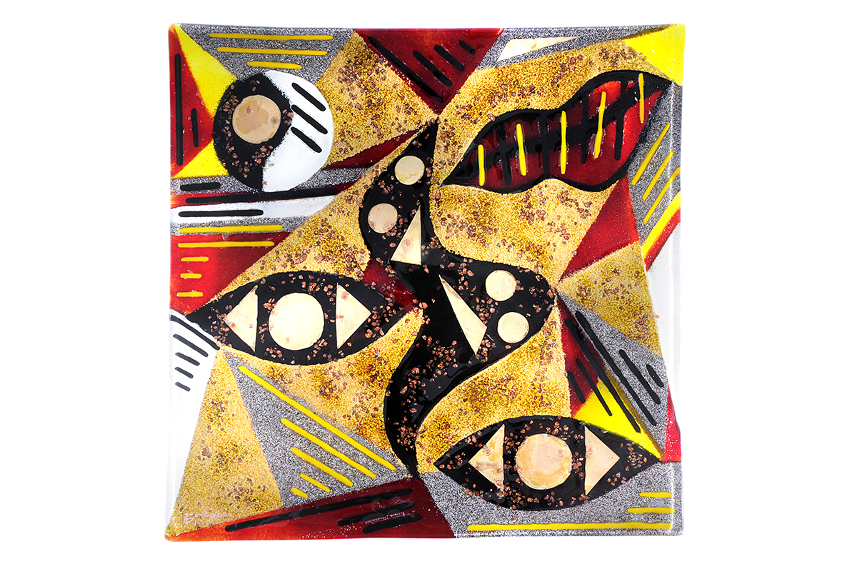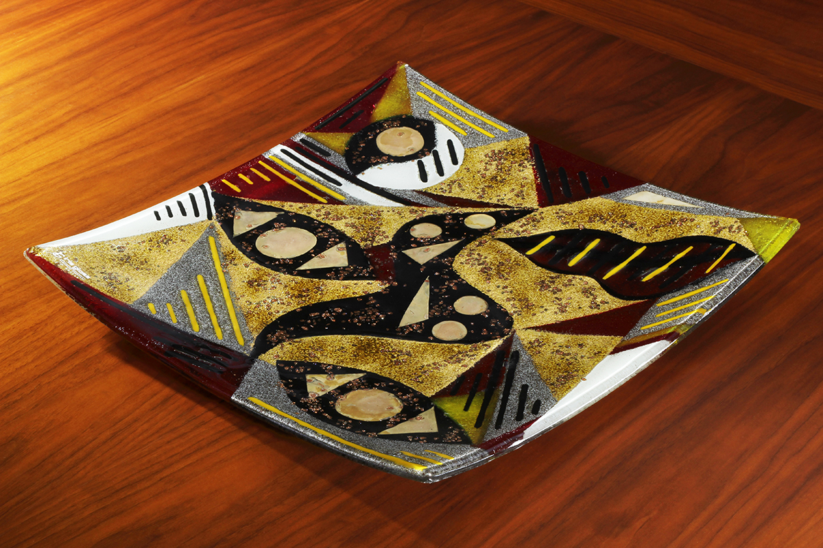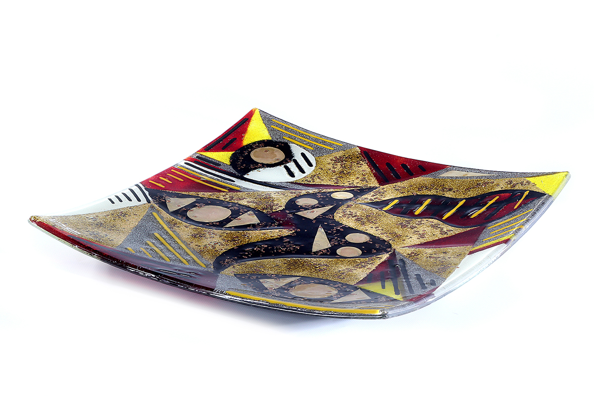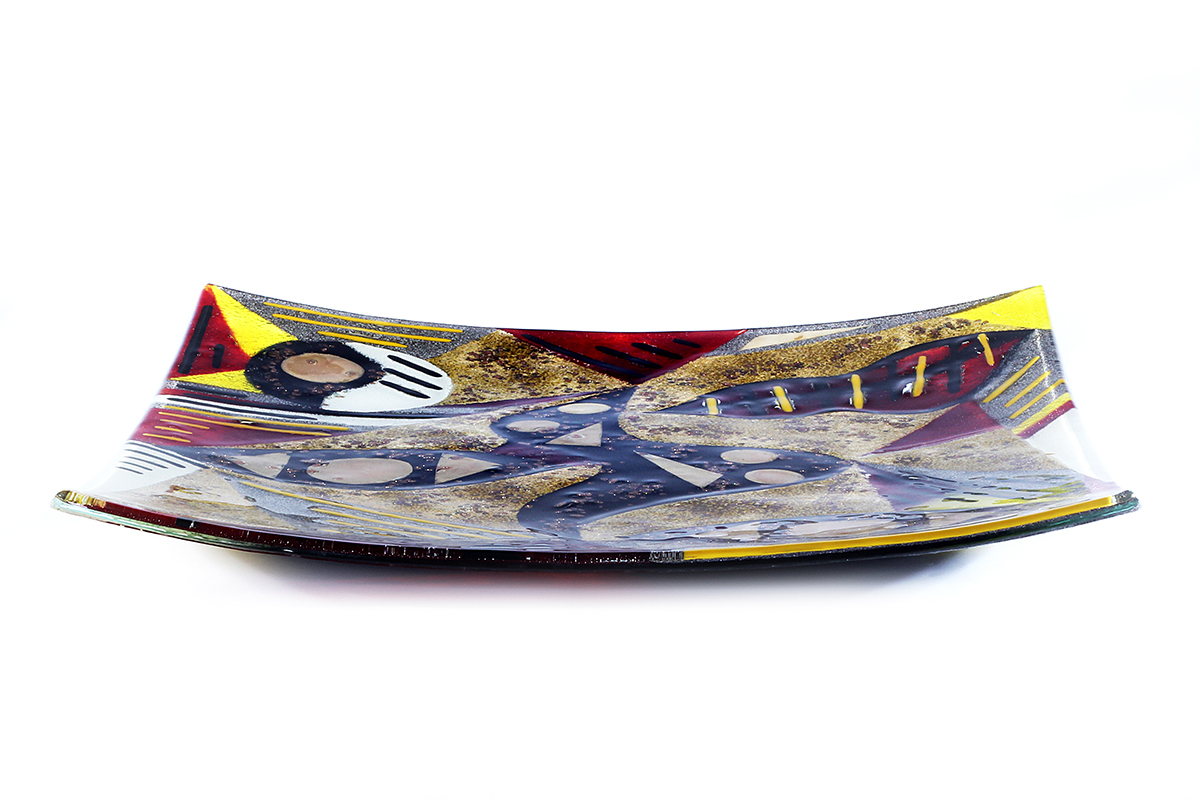 The platter is square with raised, sweeping corners. The platter base style varies depending on size. All colour is permanent and may be semi-transparent to a varying degree, allowing light to shine through. Inclusions of metal are generally opaque.