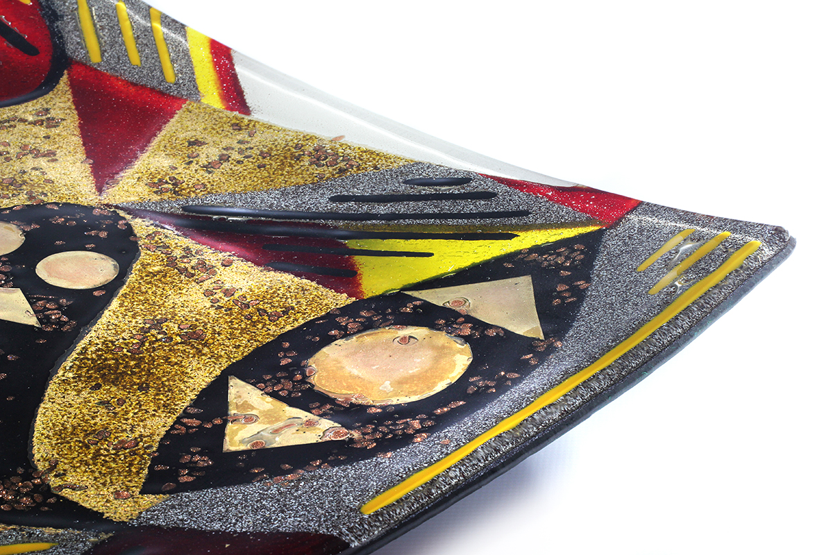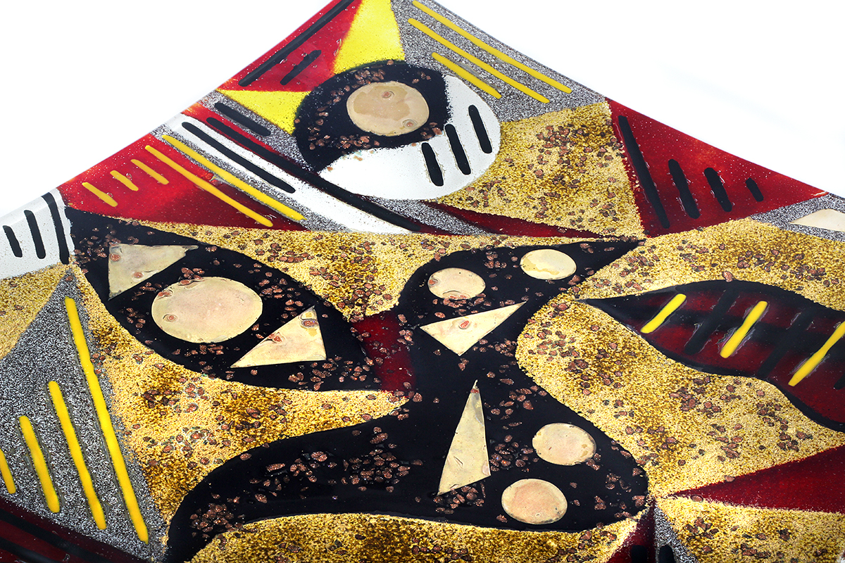 Made from solid, hand-cut glass with other varied materials used to add colour and texture within the glass. The finish is glossy smooth on the top surface and can be burnished to a shine. There may be surface irregularities and ripples, which are intended as part of the character and nature of the design. The underside is more textured, partly due to the creation process, which thankfully makes for easy carrying and transport.