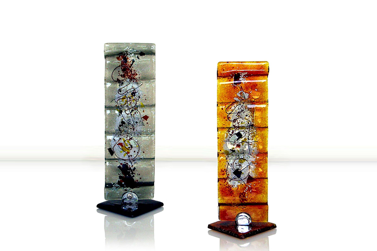 Made from solid, hand-cut glass with other varied materials used to add colour and texture within the glass. The finish is glossy smooth on the top surface and can be burnished to a shine. There may be surface irregularities and ripples, which are intended as part of the character and nature of the design. The underside is more textured, partly due to the creation process, which thankfully makes for easy carrying and transport. All colour is permanent and may be semi-transparent to a varying degree, allowing light to shine through. Inclusions of metal are generally opaque.