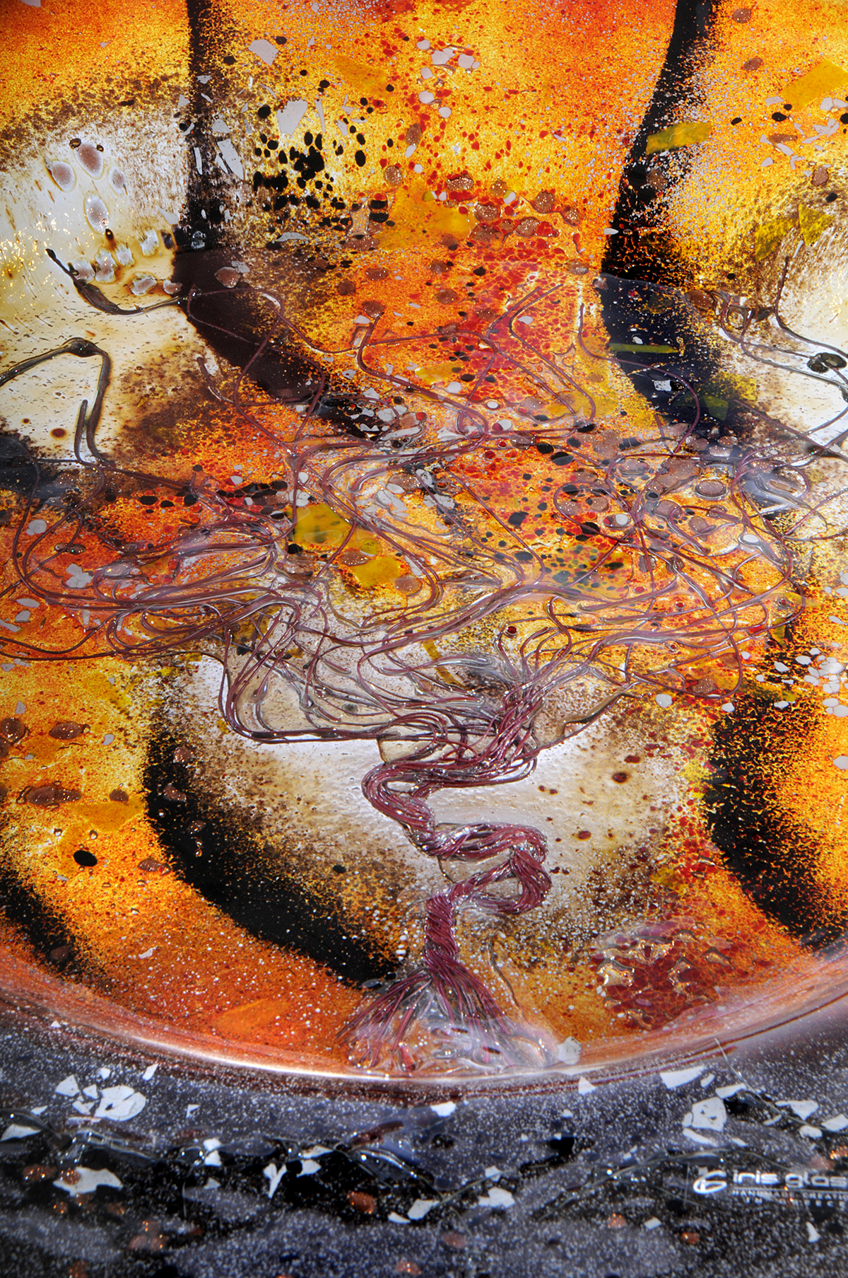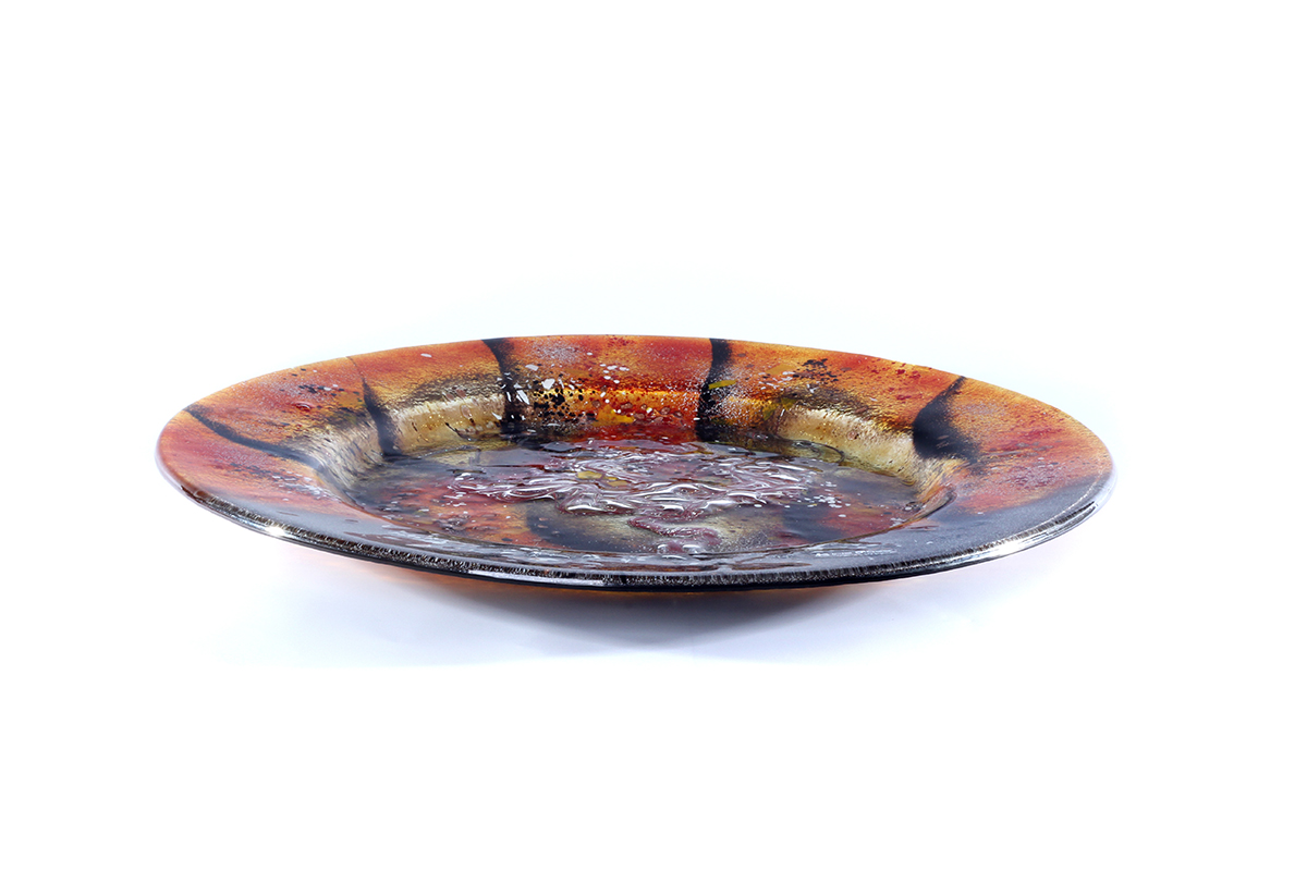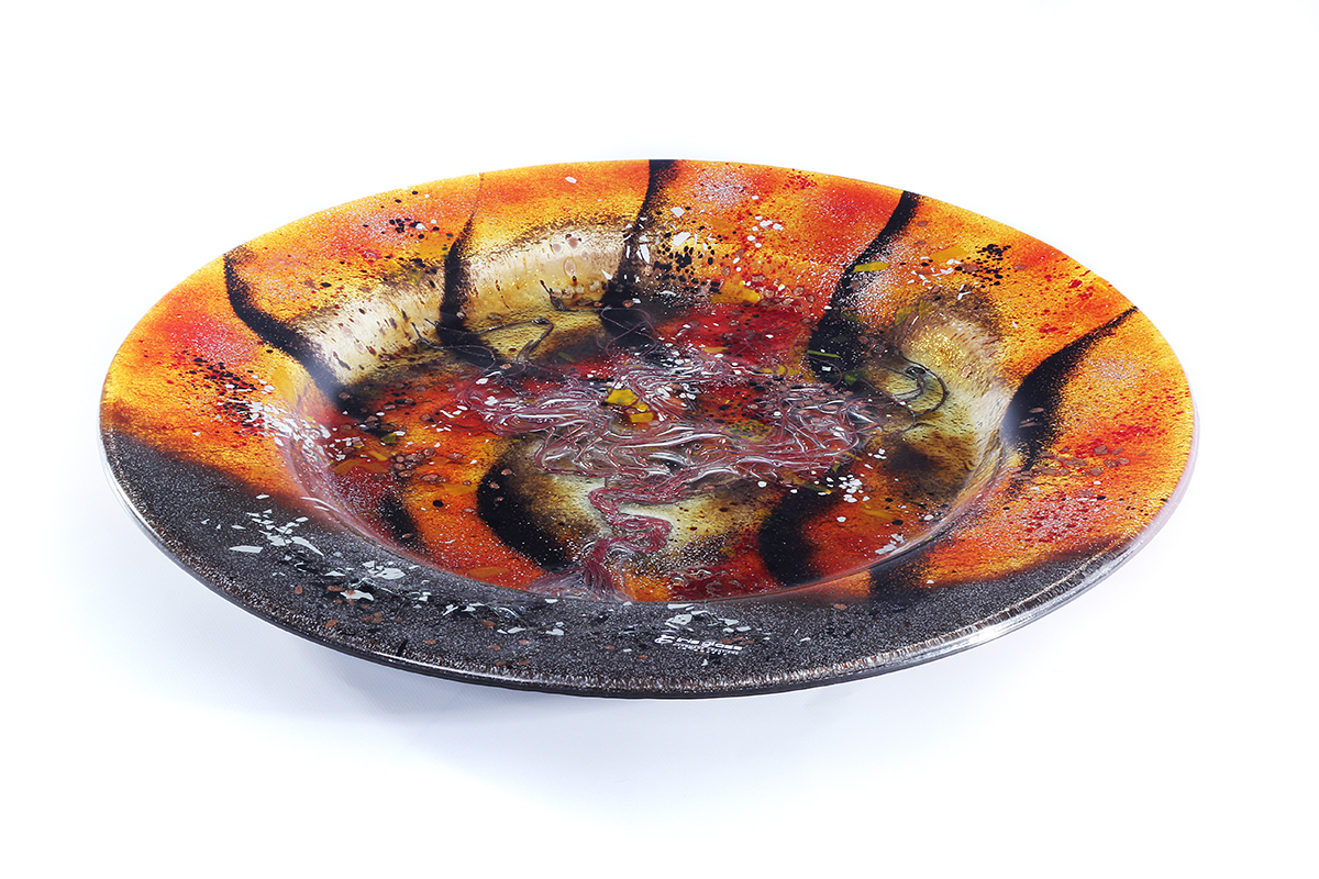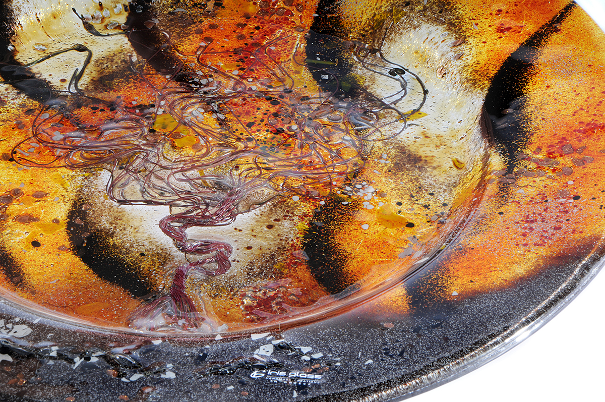 Made from solid, hand-cut glass with other varied materials used to add colour and texture within the glass. The finish is glossy smooth on the top surface and can be burnished to a shine. There may be surface irregularities and ripples, which are intended as part of the character and nature of the design. The underside is more textured, partly due to the creation process, which thankfully makes for easy carrying and transport.