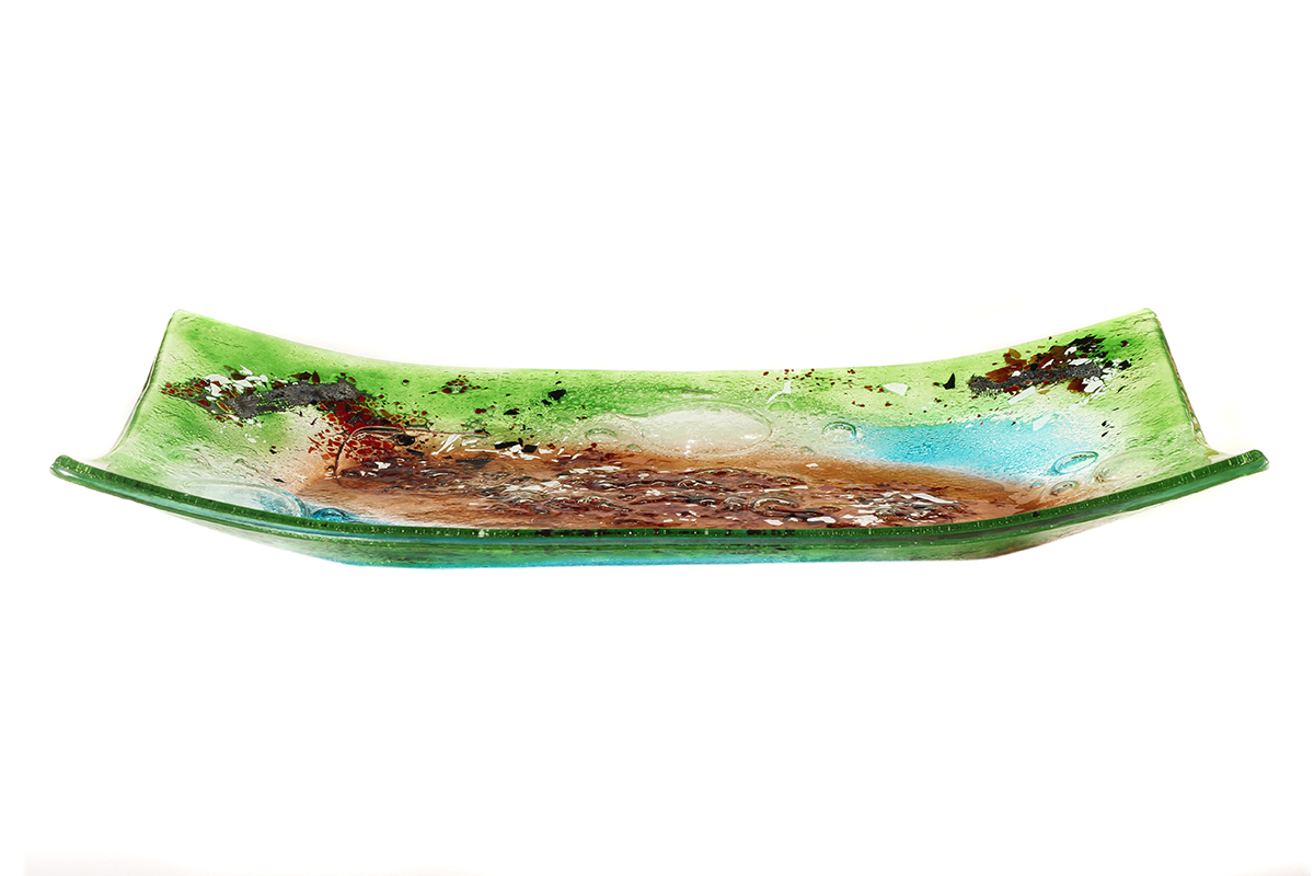 Produced in the Iris Glass workshop from hand-cut glass with other varied materials used to add colour and textures (such as bubbles), within the glass.