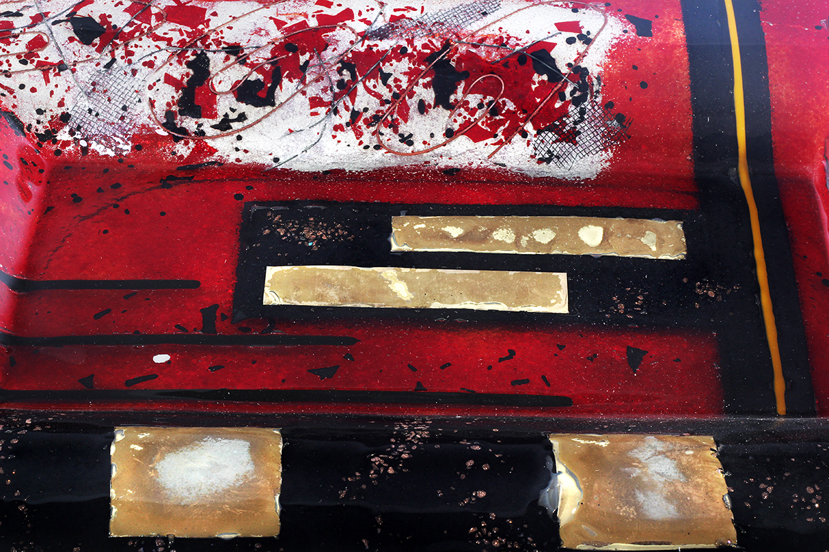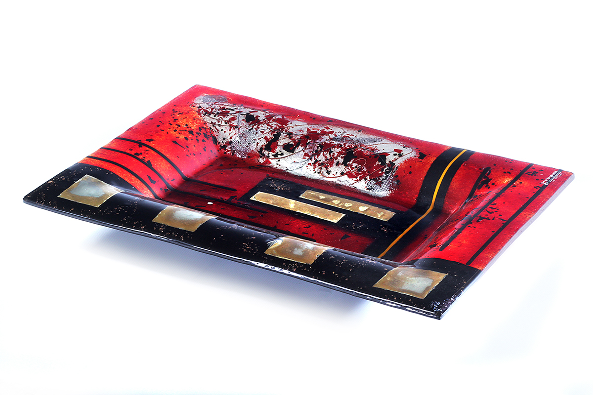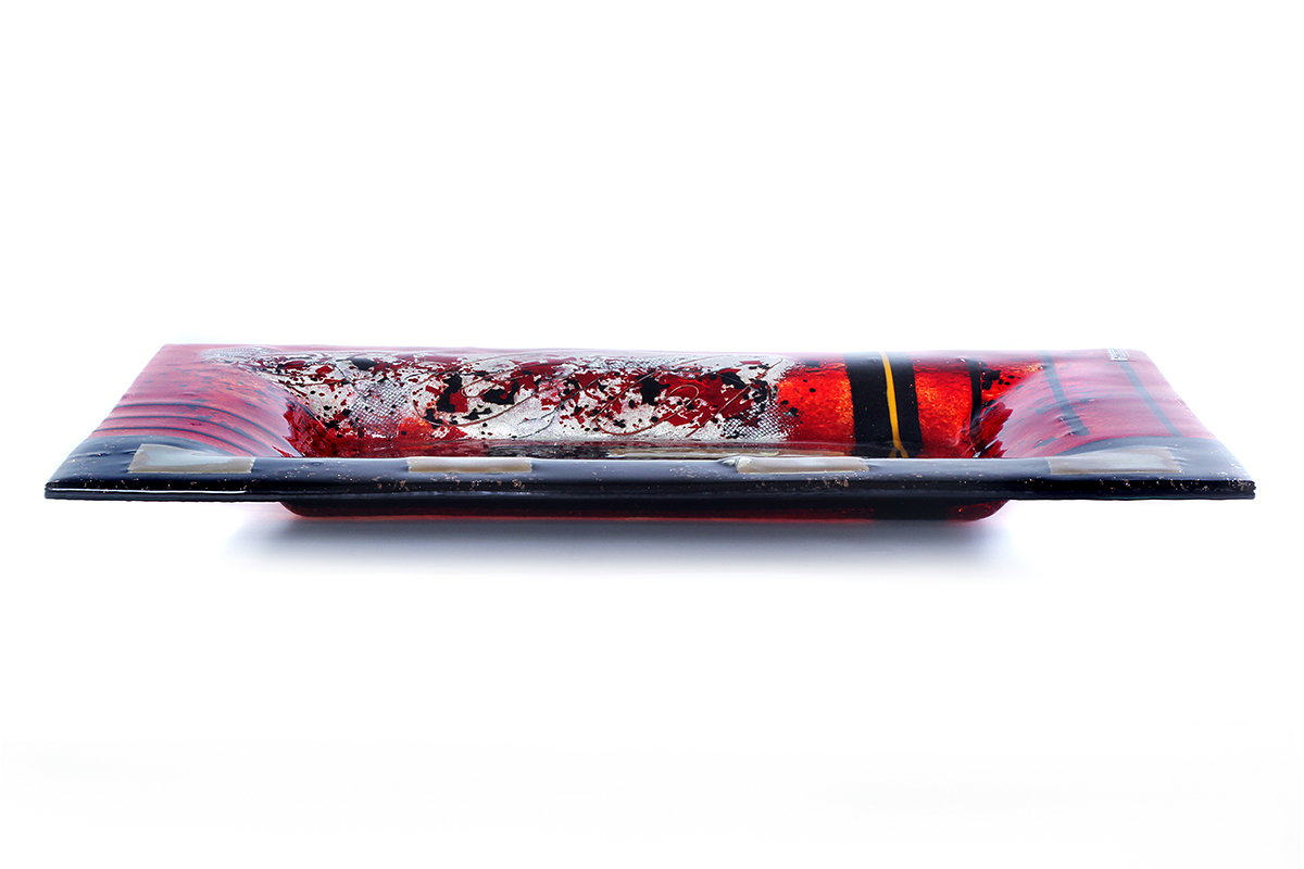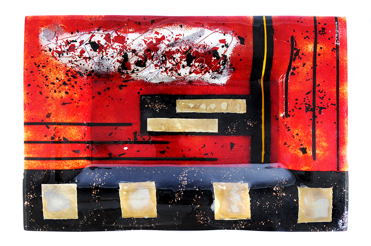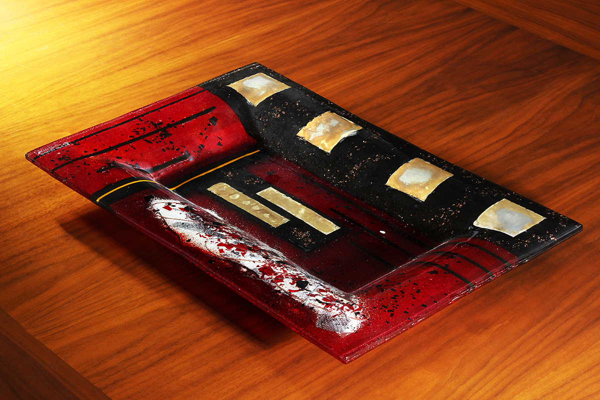 Made from solid, hand-cut glass with other varied materials used to add colour and texture within the glass. The finish is glossy smooth on the top surface and can be burnished to a shine. There may be surface irregularities and ripples, which are intended as part of the character and nature of the design. The underside is more textured, partly due to the creation process, which thankfully makes for easy carrying and transport.