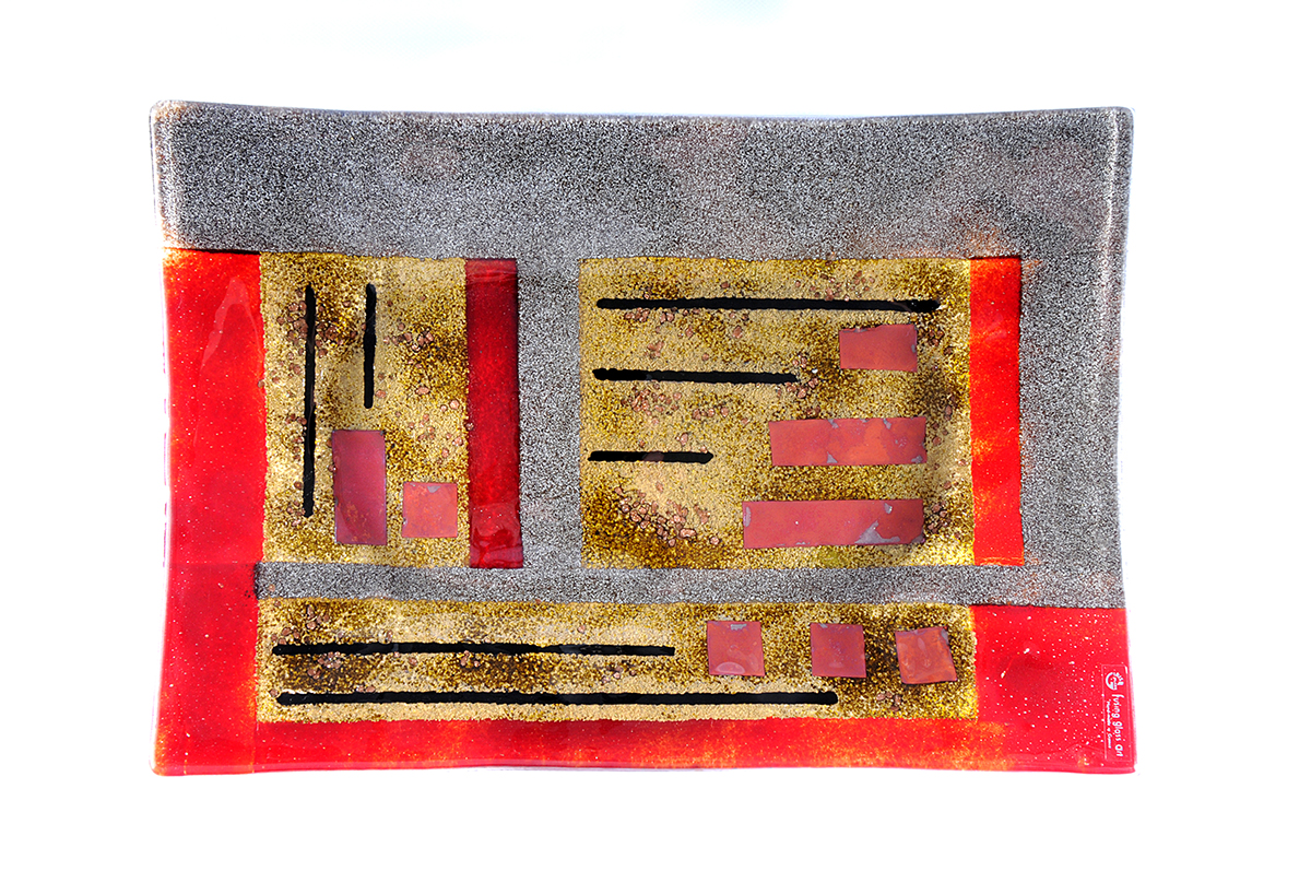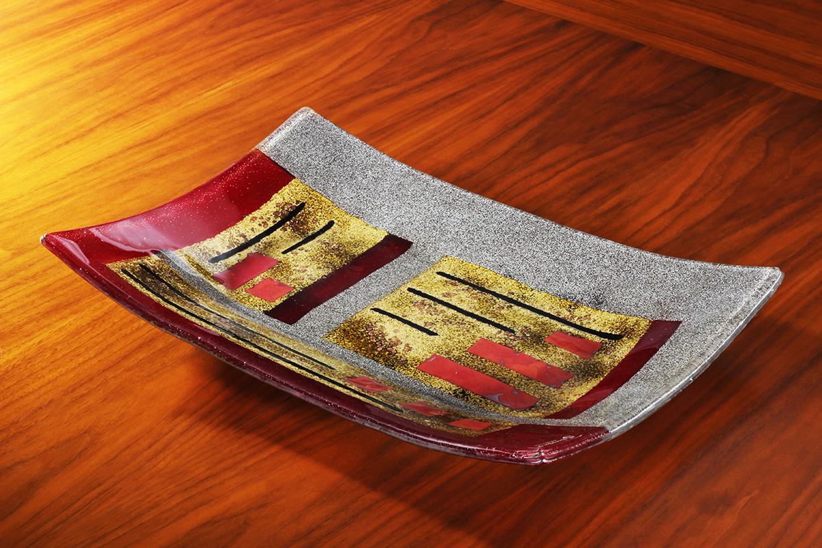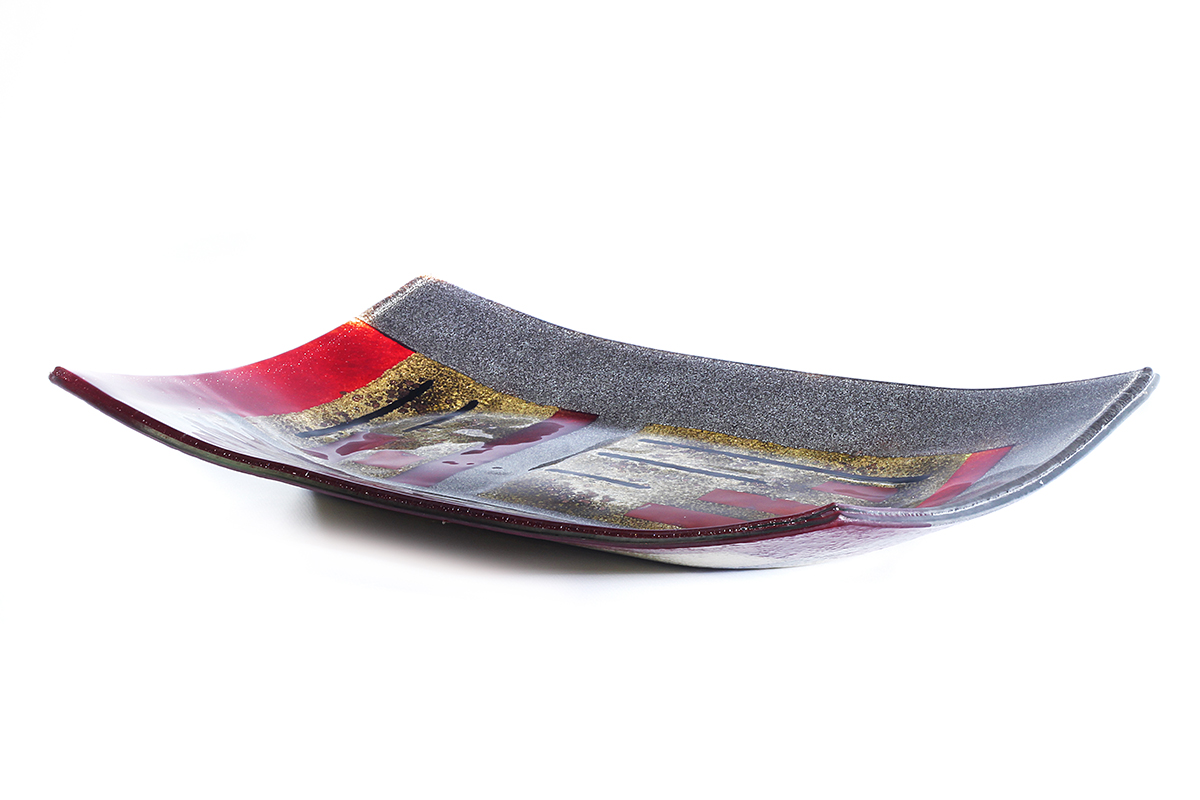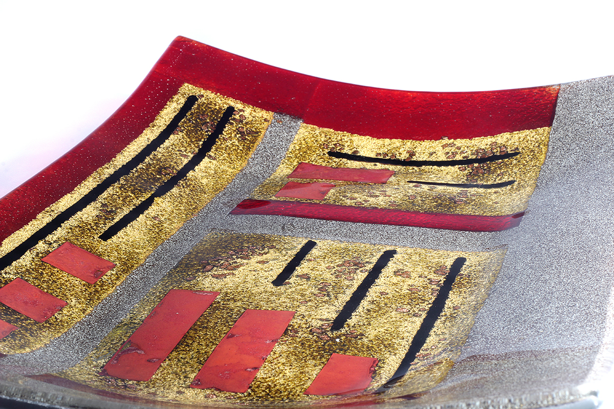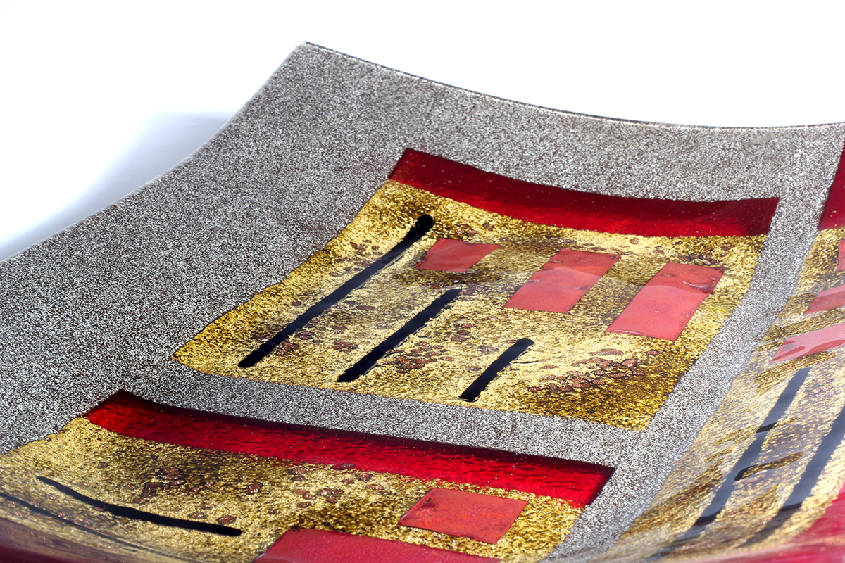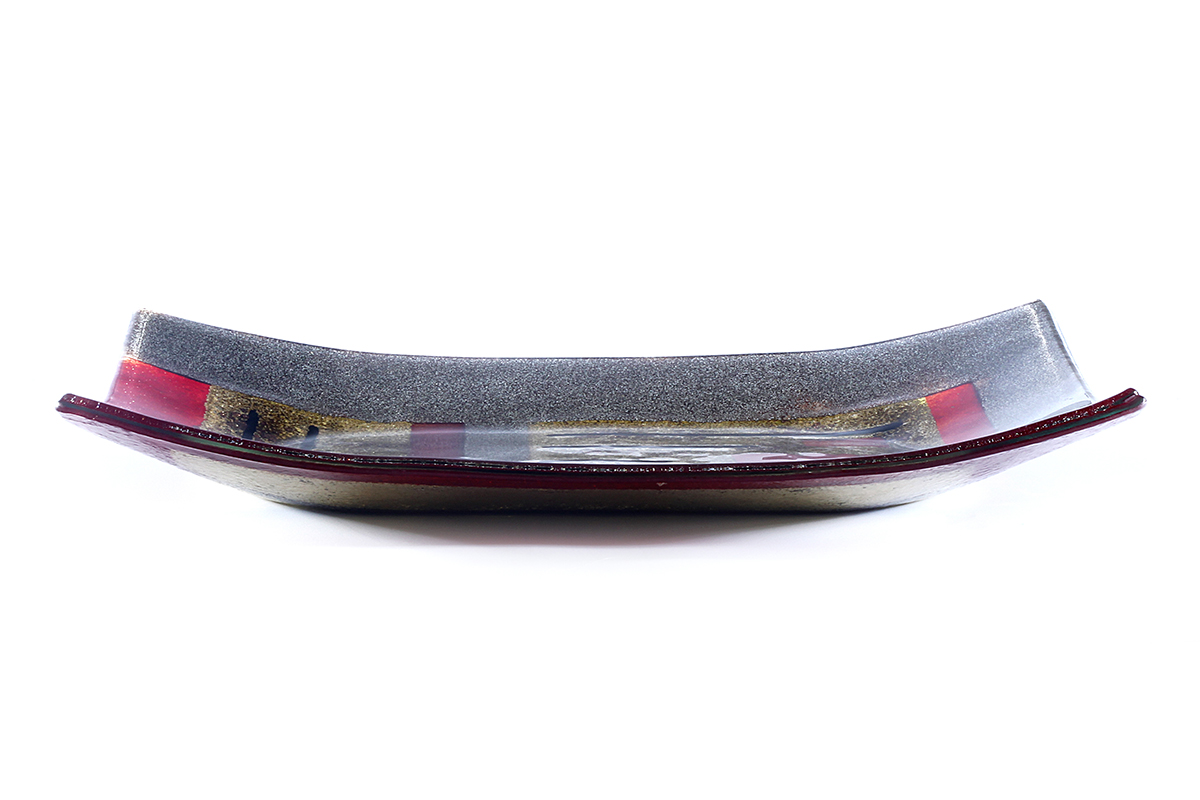 Made from solid, hand-cut glass with other varied materials used to add colour and texture within the glass. The finish is glossy smooth on the top surface and can be burnished to a shine. There may be surface irregularities and ripples, which are intended as part of the character and nature of the design. The underside is more textured, partly due to the creation process, which thankfully makes for easy carrying and transport.